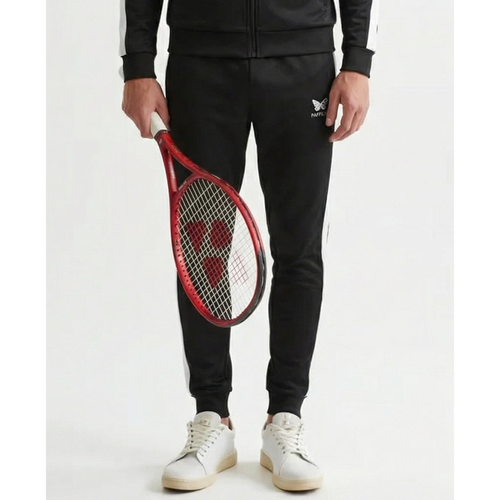2 x Seitentaschen und eine Gesäßtasche mit Reißverschluss. Beinsaum mit elastischen Bündchen. Mit weißen Streifen seitlich am Bein